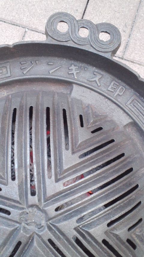 これがジンギス印のジンギスカン鍋全景です。七輪のように炭を燃料として遠赤で焼けた美味しい肉がいただけました。