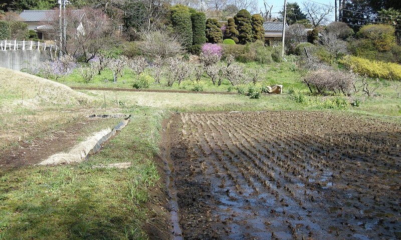 絹の道の資料館の前は田んぼが広がっていて対面の丘にサクラの木があります。